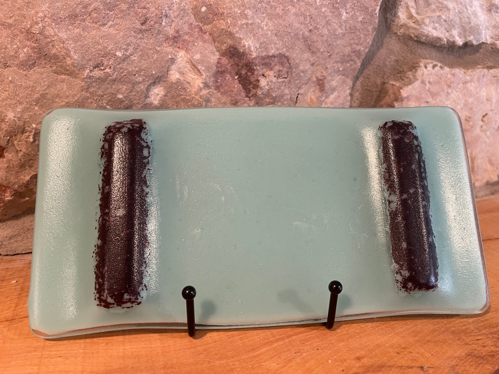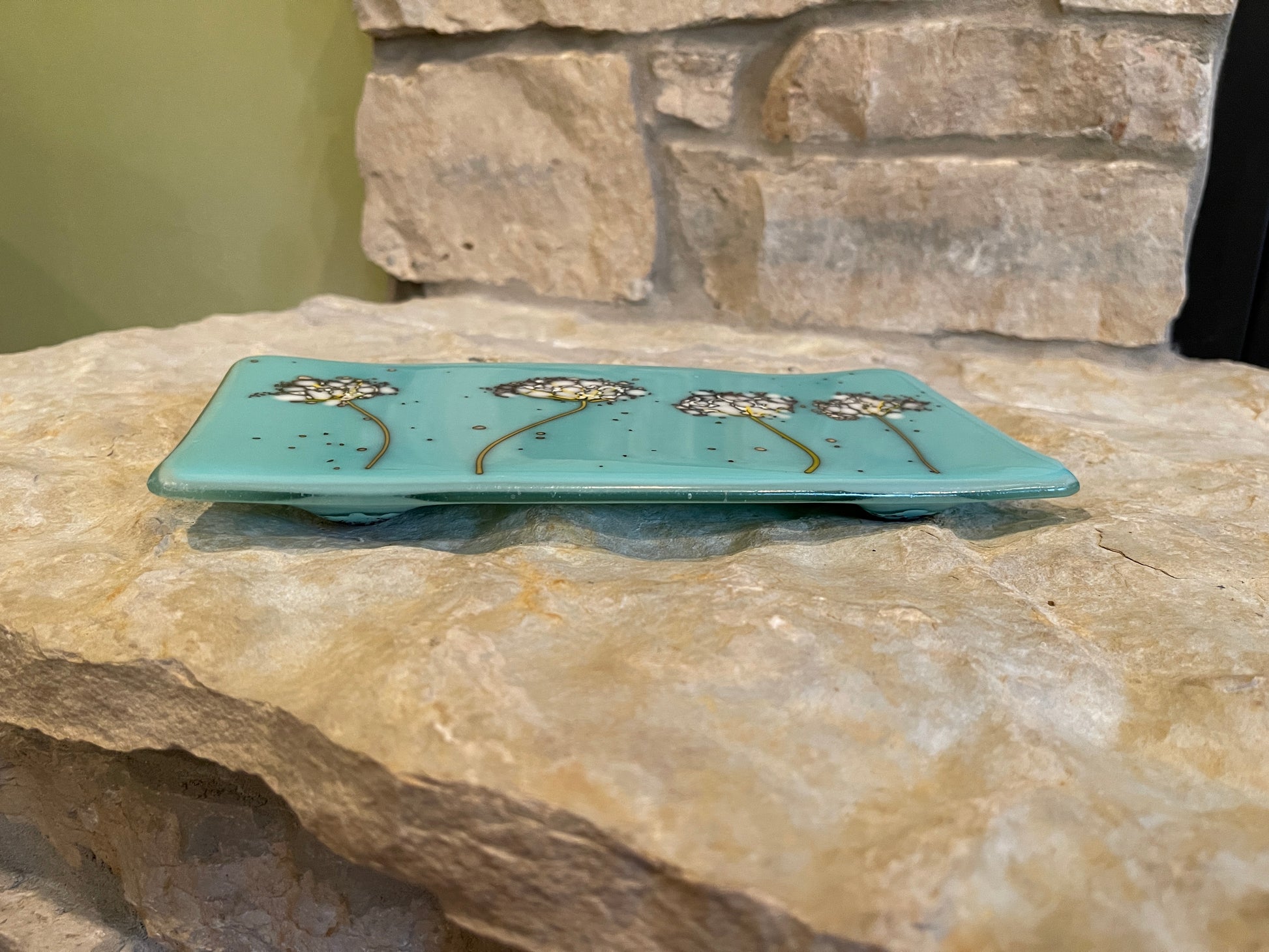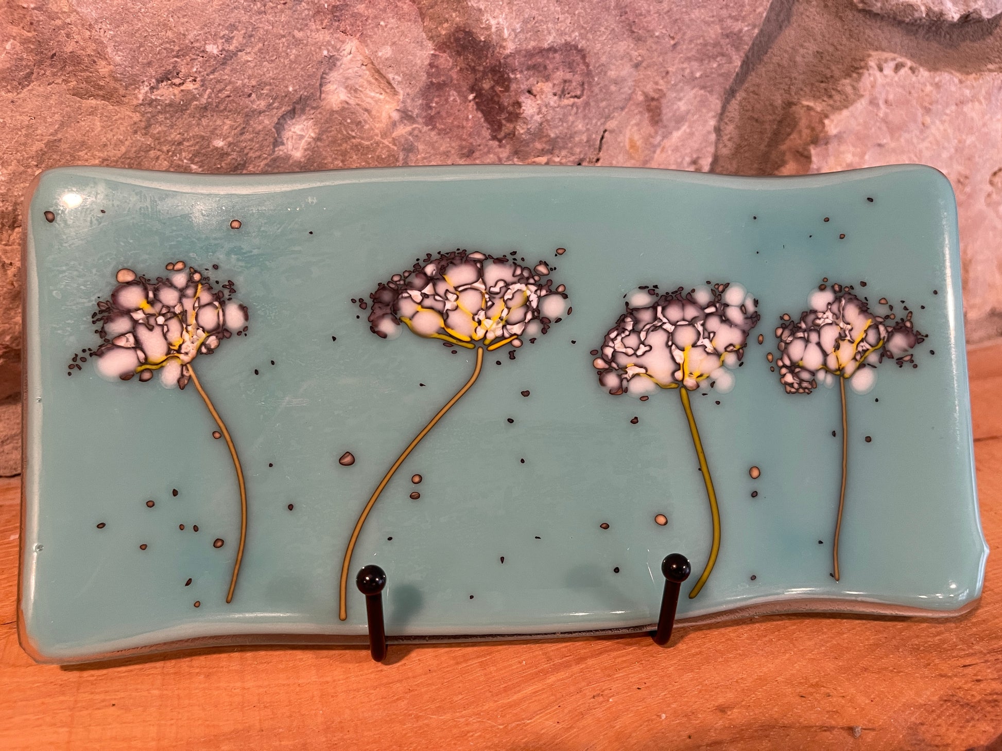 Step up entertaining at home. 9" x 5" footed sushi tray in a spring-like Robin's egg blue. Artistic interpretation of four Queen Anne's Lace flowerheads created using reactive glasses, frit, and stringers fused together to create a unique serving tray. Display stand not included.